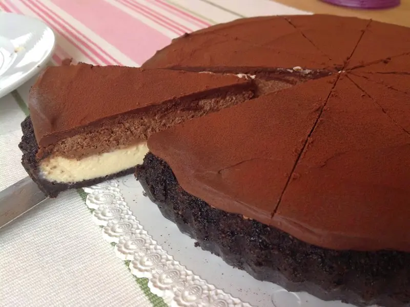 Tenhle mi chutí trochu připomíná Míša řezy, asi především díky kombinaci sýrové vrstvy a čokoládové polevy na povrchu. Zaujalo mě, že je pečený v koláčové formě, což sice vypadá hezky, ale zrealizovat už to bylo horší 🙂