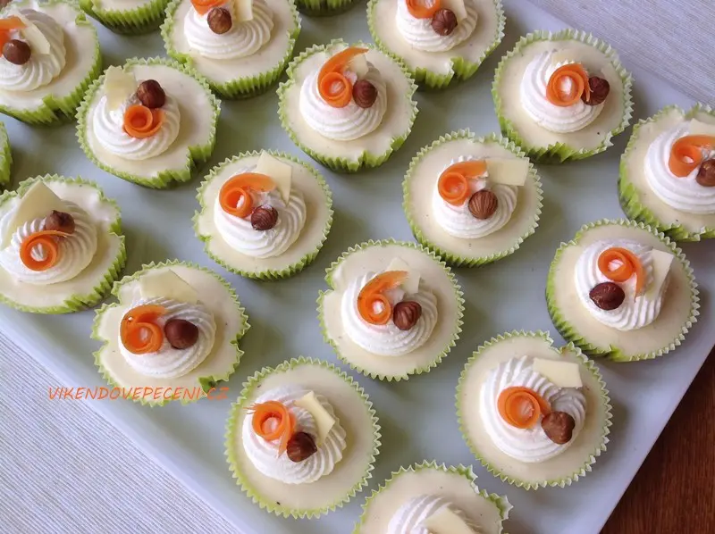 Vychladlé dortíky můžete přizdobit ušlehanou šlehačkou, ořechy a kousky mrkve.