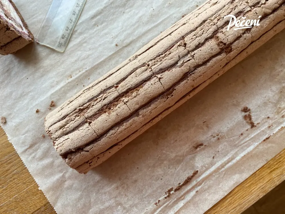 Právě svým tak trochu netypickým vzhledem mě tahle roláda zaujala. Těsto se neroztírá na plech paletou, ale stříká se pomocí sáčku v pruzích. Kromě zajímavého tvaru to má i praktickou stránku, roláda se lépe stáčí. Další zajímavostí je fakt, že je připravena jen z bílků, takže je to vlastně „bezé“ roláda.