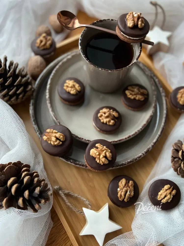 Asi dvě třetiny čokolády rozpusťte (tady se dočteš, jak na to), přidejte kakaové máslo a zbylout třetinu čokolády a míchejte do úplného rozpuštění. V čokoládě postupně máčejte jednu polovinu slepených koleček a ještě než poleva ztuhne, položte na každé kolečko půlku ořechu. Nechte v chladu několik dní po naplnění rozležet.