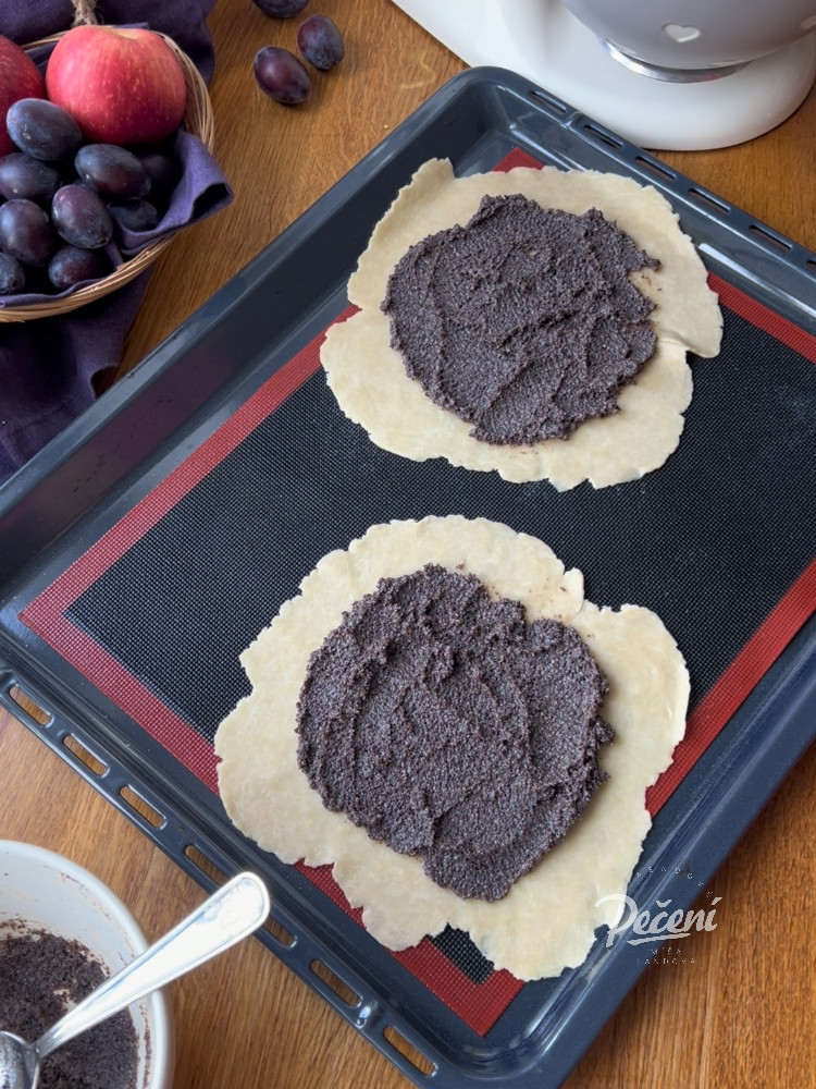 Odleželé těsto rozdělte na čtyři díly a každý vyválejte na tenkou placku o průměru asi 20-22 cm. Rozložte je na dva plechy vyložené papírem na pečení nebo perforovanou podložkou. Těsto propíchejte vidličkou a pomažte makovou náplní. Zhruba 2-3 cm těsta po okraji nechte volné.