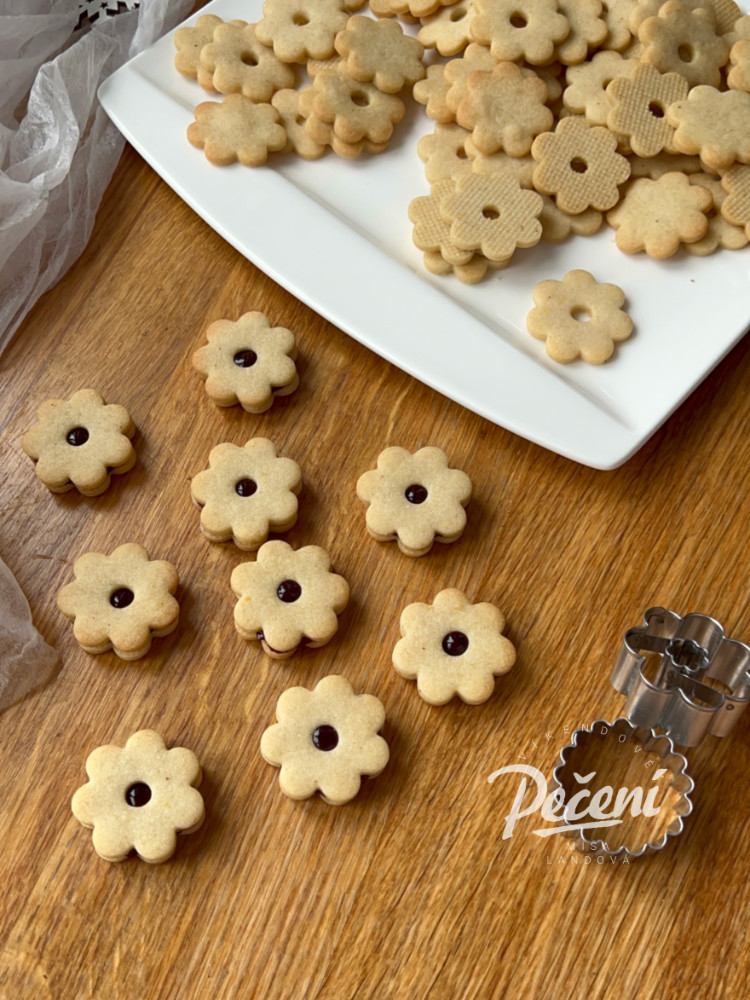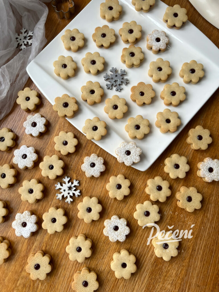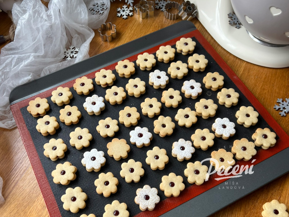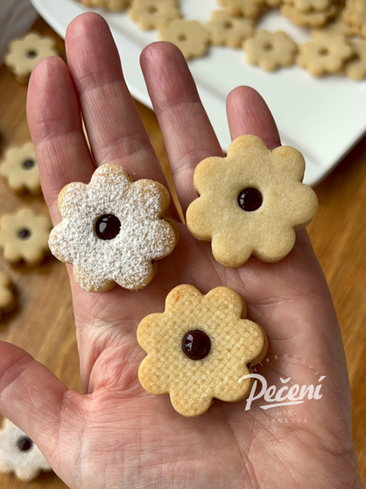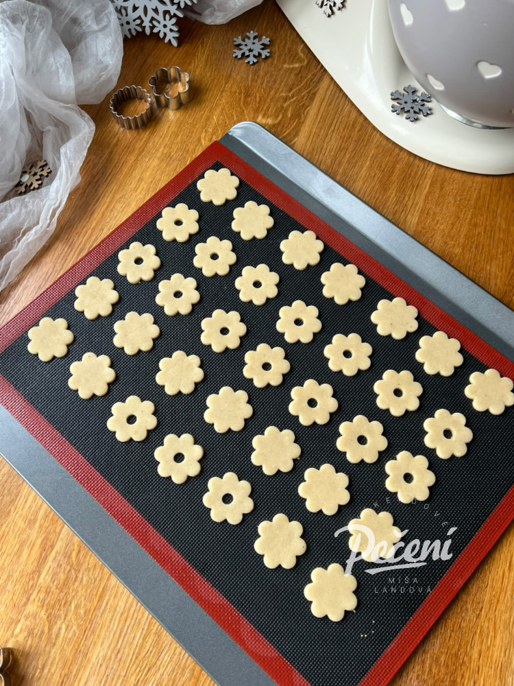 Odleželé těsto po částech rozválejte na sílu 4 mm a vykrajujte oblíbené tvary. Jedna polovina by měla být s otvorem uprostřed, ale klidně mohou být i obě plné. Kousky poskládejte na plech vyložený papírem na pečení nebo preferovanou podložkou (lépe vede teplo) a pečte v troubě vyhřáté na 170 stupňů (horkovzuduch) asi 7-8 minut. Délka pečení je orientační a je závislá na velikosti kousků a síle těsta.