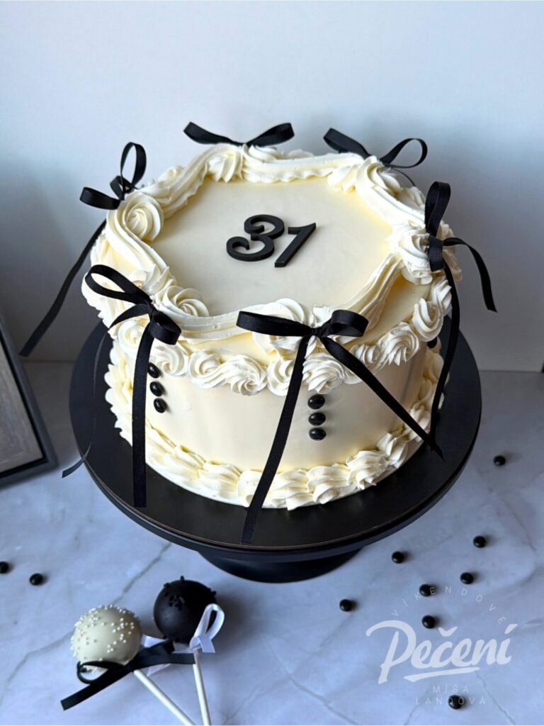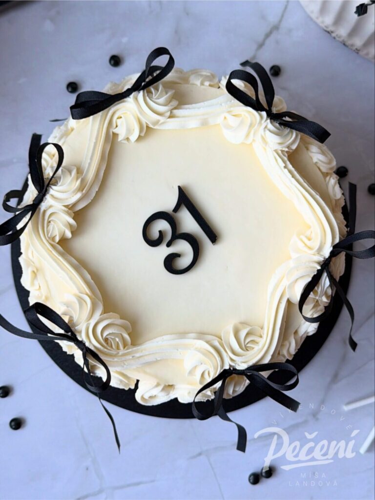 Než krém zcela zatuhne můžete přidat stužky uvázané do mašliček. Já jsem použila běžnou saténovou stuhu o šířce 6 mm, kterou koupíte v galanterii. Dort jsem dozdobila černým číslem z překližky a černými mini lentilkami. Vše, včetně černé podložky pod dort, jsem pořídila na cukrářském e-shopu LKstore.