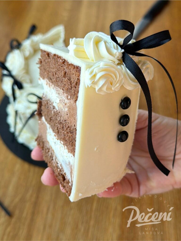 A co se skrývá pod povrchem dortu? V podstatě tam může být cokoliv, u nás vyhrál oblíbený harlekýn, tedy kombinace kakaového korpusu, pařížské a bílé šlehačky. I když to možná na první pohled nevypadá, dort je má jen 16 cm v průměru a je dvakrát propojený. Ale minimálně osm porcí z něho uděláte bez problému 🙂
