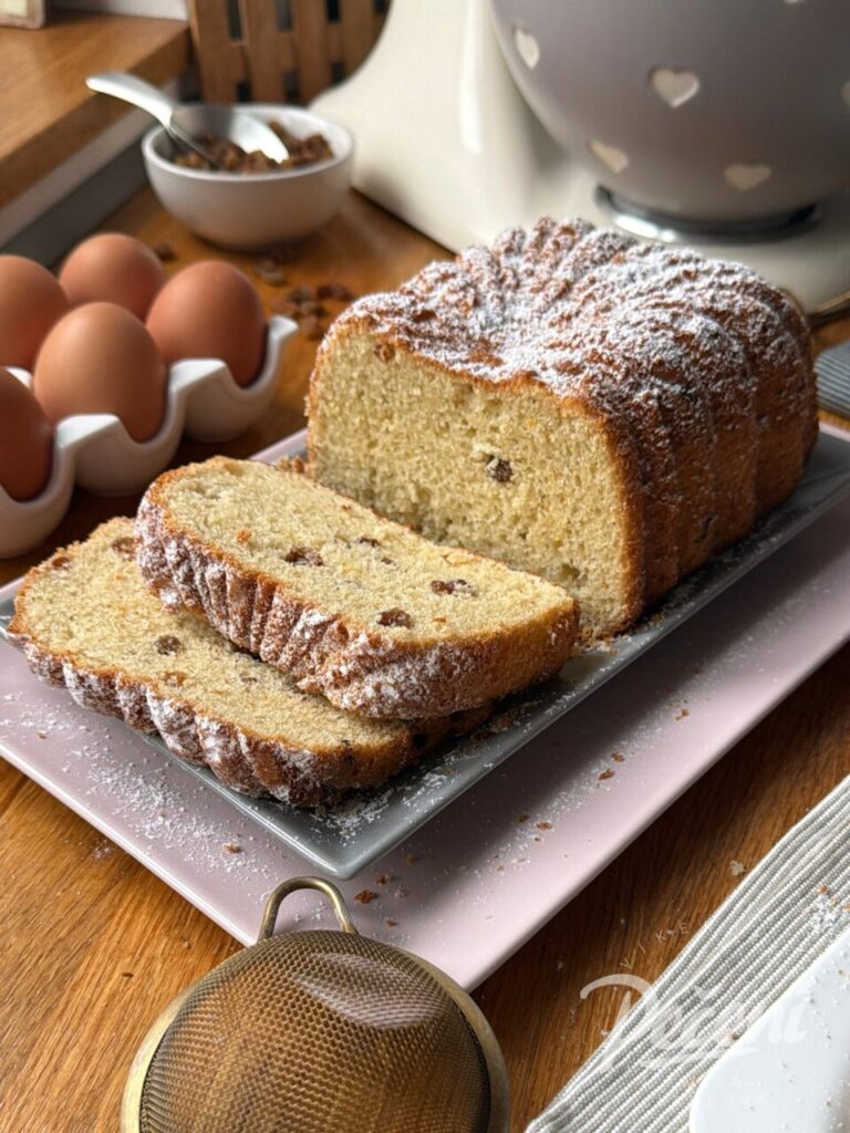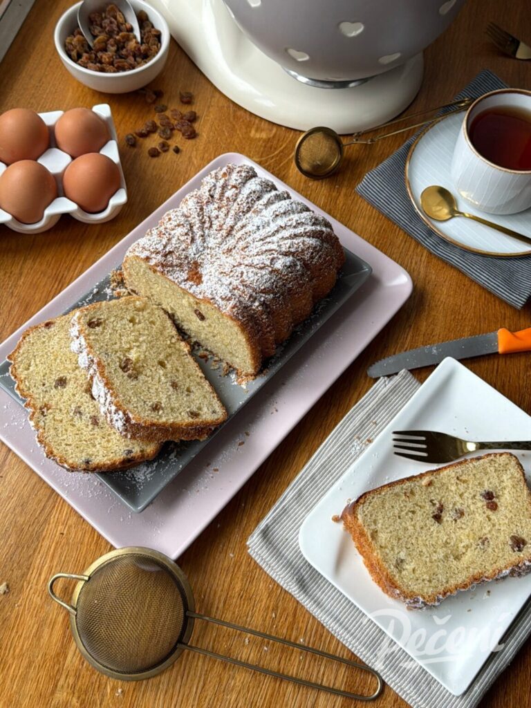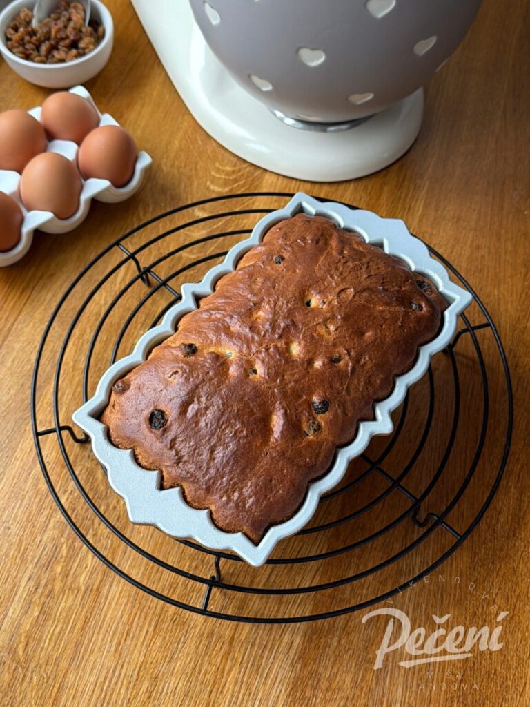 Na rozdíl od většiny kynutých těch se máslo s cukrem a vejci vyšlehá, což mu dodá specifickou konzistenci. Těsto je vláčnější, možná i trochu lepivé, ale ve formě to vůbec nevadí. Vlastně je docela jednoduchá, protože těsto po přípravě kyne rovnou ve formě, a není třeba ho nějak tvarovat. Kromě rozinek můžete přidat, mandle či ořechy, jiné sušené ovoce nebo strouhanou čokoládu.