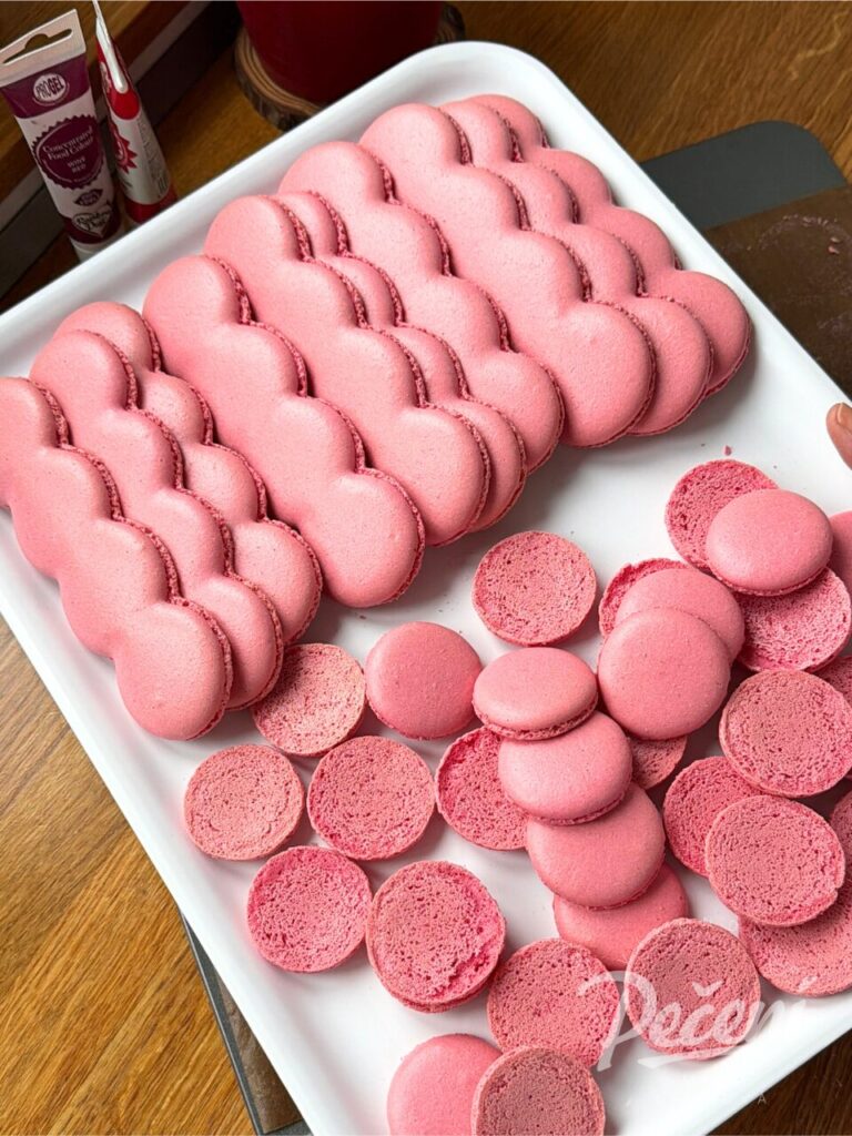 Makronky jsou samy o sobě malé cukrářské umění. Vyžadují trpělivost, přesnost a respekt k detailu – ale když se povedou, stojí to za to. V téhle verzi jsem si s nimi trochu pohrála a změnila jejich tvar, aniž bych změnila jejich podstatu. Výsledkem je dezert, který působí jako malý dortík z vitríny, ale technicky vychází z klasické makronkové skořápky.