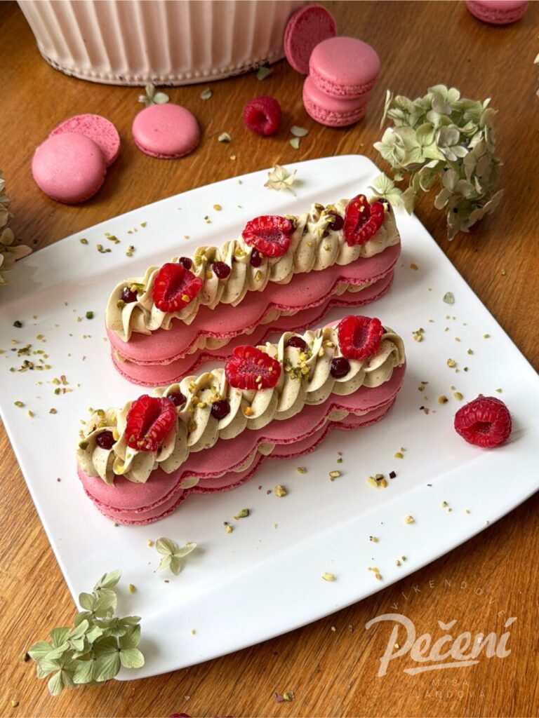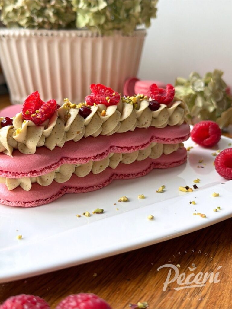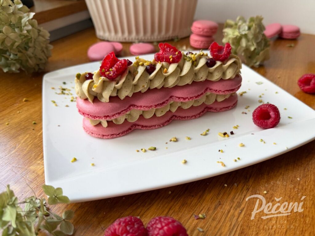 Občas stačí malá změna tvaru a vznikne úplně nový dezert. Čtyři makronková kolečka vedle sebe, vrstva pistáciového krému, kapky malinového želé – a z klasické makronky je rázem malý dortík. Pistácie a malina jsou kombinací, která funguje téměř bezchybně. Jemná chuť pistáciového krému krásně kontrastuje se svěží kyselostí malin. Dezert tak není přeslazený, ale vyvážený, každé sousto má hloubku i svěžest.