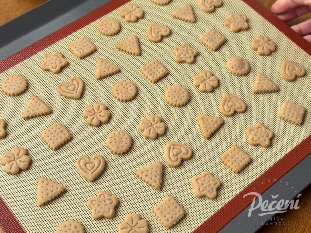 Podobně jako vánoční cukroví jsem i tyhle sušenky pekla na perforované podložce. Díky malým otvorům v podložce, se teplo při pečení rozmístí rovnoměrně a kousky se tak lépe propečou. Podložka se hodí na většinu plechů, já mám nejradši ty rovné bez okrajů, které jsou lehké a vejdou se mi i do lednice.