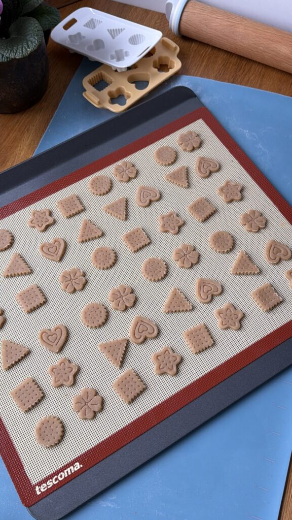 Obecně mám ráda cukroví menších tvarů, takže mi velmi vyhovuje sada vykrajovátek na linecké, které k mé lítosti přestala Tescoma vyrábět. Nicméně nově má v nabídce Vykrajovací formu s razítky na mini cukroví či sušenky. Ideálně, když pečete třeba s dětmi, protože vykrojíte a přenesete více kousků najednou. Hodně využívám také plastová oboustranná vykrajovátka a klasická nerezová vykrajovátka srdce a kulatá v sadě, kde je více velikostí. V základní výbavě nesmí samozřejmě chybět ani vykrajovátko na linecké kolečko se středem.