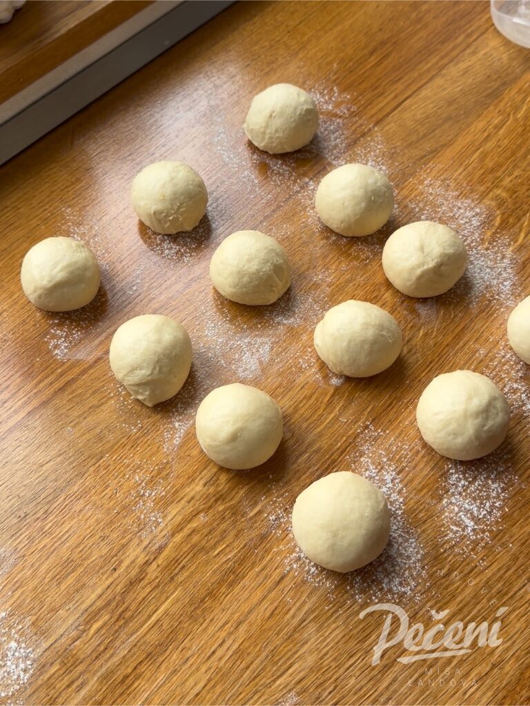 Vykynuté těsto rozdělte na 12 kousků, každý vyválejte do kuličky a nechte znovu zakryté nakynout.