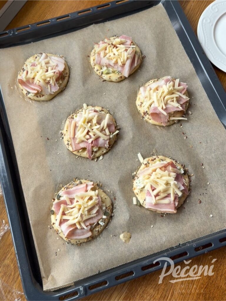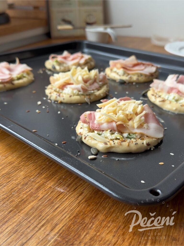 Pak každý kousek vytvarujte do koláče, okraje pomažte odloženým vajíčkem s kapkou mléka a posypte semínky. Koláče naplňte krémovou náplní, obložte slaninou nebo šunkou a posypte sýrem.